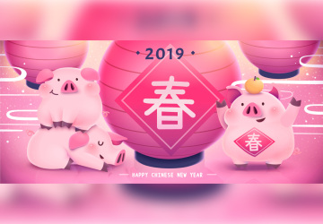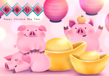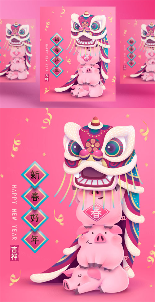图穷联素材库 » 新年丰满的猪和金锭迎春纳福粉红系传统年画矢量海报素材
