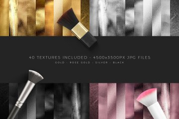 我们提供了40种纹理(金色,玫瑰金色,银色和黑色)来应用它们,如果你想要一个花哨的豪华金属箔外观你的标志。纹理包含在JPG文件中,因此它们可以在任何软件中使用。