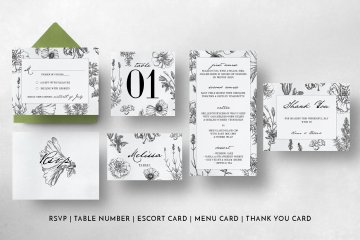 您的套餐包括:婚礼邀请,保存日期,回复,表号,护送卡,菜单卡和感谢卡给您的客人; 每个细节都很容易编辑。至于PSD,图层排列整齐,颜色突出,您可以自己定制或自己创建一张新卡!