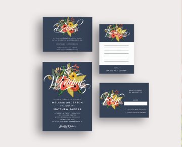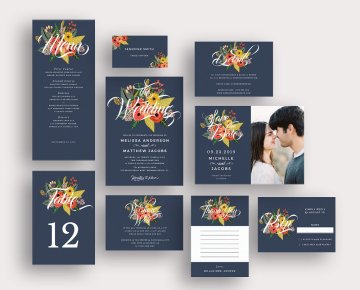 此套装包括9个匹配的邀请和卡:婚礼邀请,回复,详细信息卡,保存日期,菜单,谢谢,许愿,护送卡和表号卡。