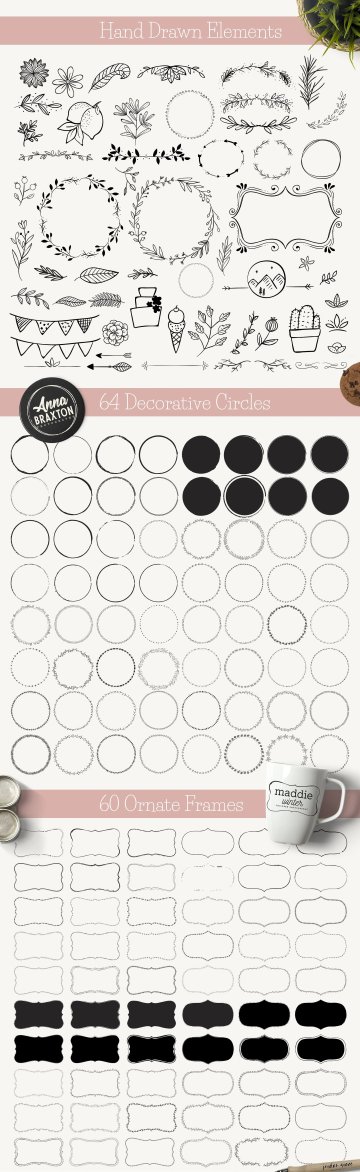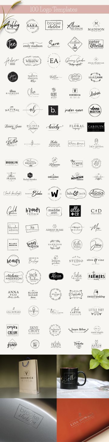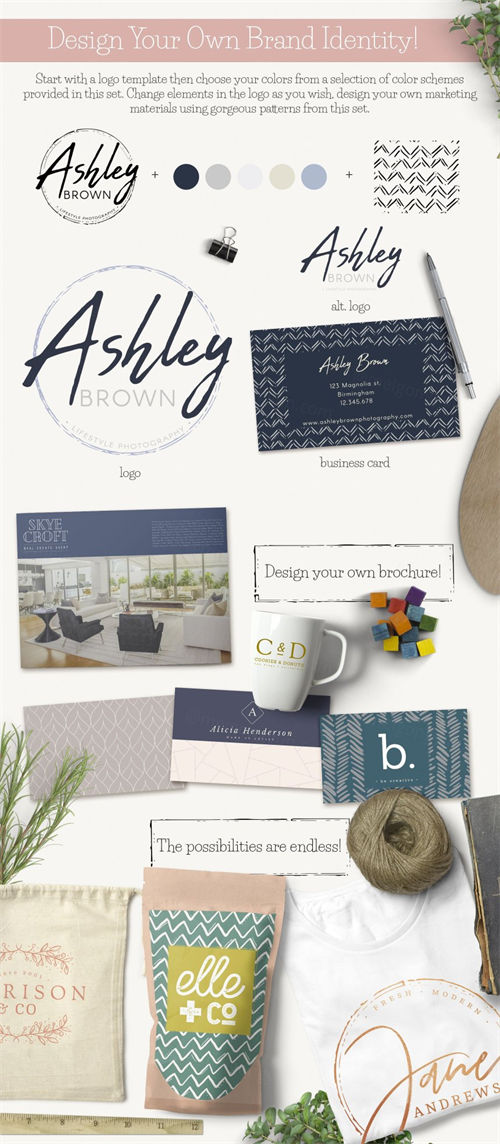 使用这个必不可少的品牌设计设计您自己的品牌标识!充满徽标模板,手绘元素,不同形状的装饰框架,图案和配色方案,您可以创建自己的惊人品牌!