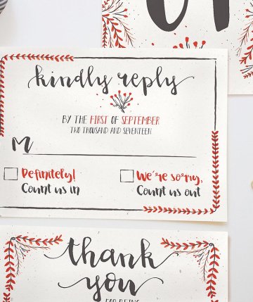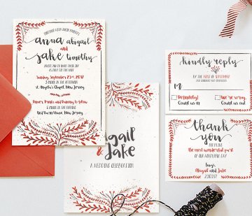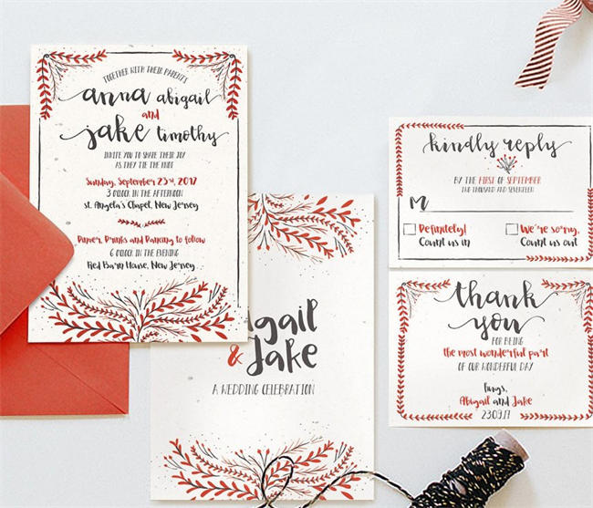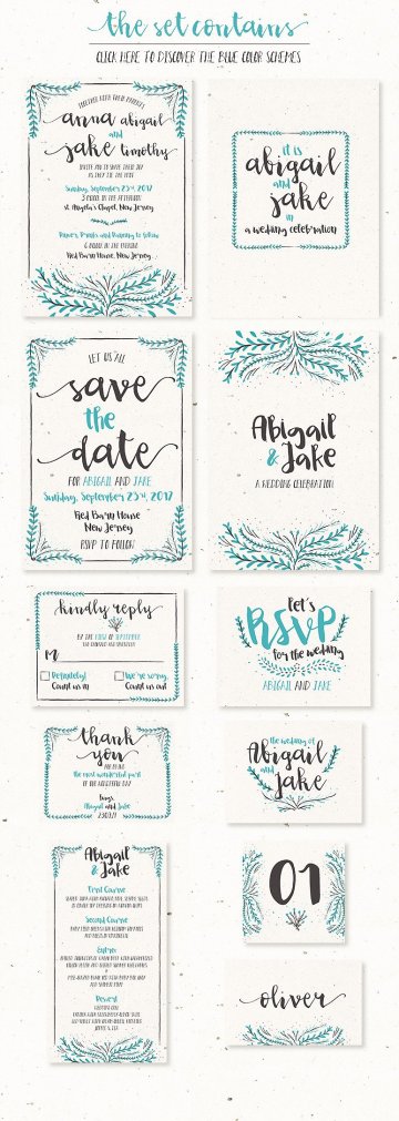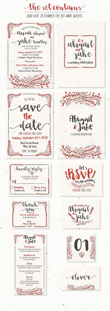 你有什么包括:婚礼邀请,保存日期,回复,表号,护送卡,菜单卡和感谢卡为您的客人。所有设计都以2种颜色调色板呈现给您:红色和蓝色。