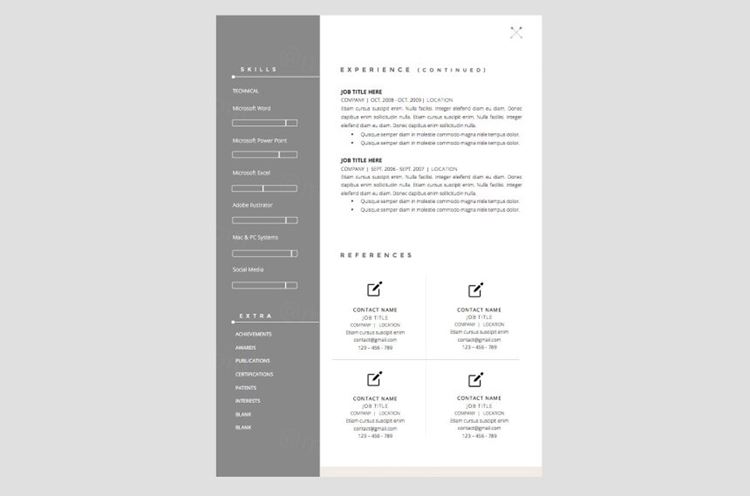 这组合集可轻易编辑,您可以改变颜色,添加/删除任何东西,复制/粘贴,添加/删除照片,或者根据您的需要移动部分元素。您还可以删除“技能部分”中的栏,只使用文本。
