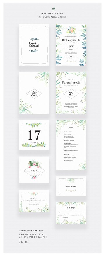 春天婚礼集合的亲吻。包括:保存日期,邀请,回复,详细信息,感谢卡,护送卡,菜单,表号。模板已打印好。只需用您自己的信息替换文本即可。