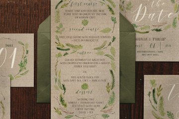 手绘水彩树叶婚礼请柬贺卡设计模板 Watercolor-Foliage-Wedding-Suite