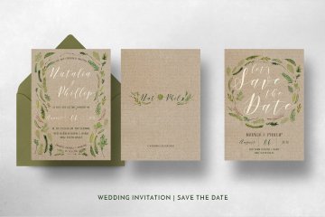 图穷联素材库 » 手绘水彩树叶婚礼请柬贺卡设计模板 Watercolor-Foliage-Wedding-Suite