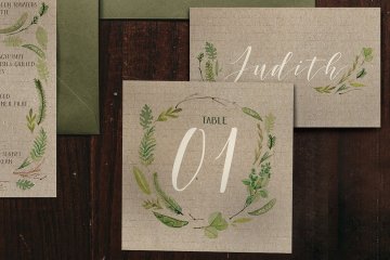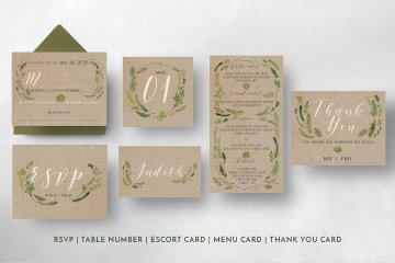 这是一组由水彩画树叶元素制成的乡村婚礼请柬,合集里包括了婚礼请柬,保存日期,回执,桌号,三陪卡,菜单卡,感谢卡,每个细节都很容易编辑。