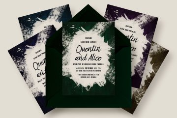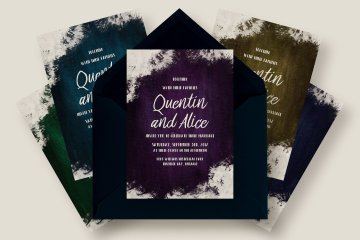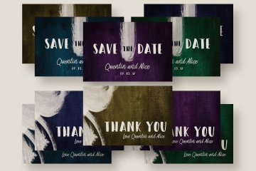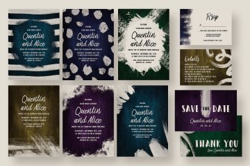 这组现代别致的模板合集包括了:婚礼邀请(6),RSVP,信息卡,保存日期,菜单,感谢卡,张贴卡和号码模板与5个丰富的彩色背景,所有文本和字体颜色都是可编辑的。