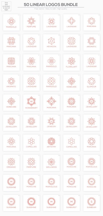 这组合集包括了50款线形 Logo 模板,这些简单但有创意的标志是酒店、婚礼管理机构、餐厅、美容院、房地产、家具、装饰、时装和服装、珠宝店、摄影、香水、化妆品或其他不同类型的奢侈品企业用于设计他们的企业标识的理想模板。