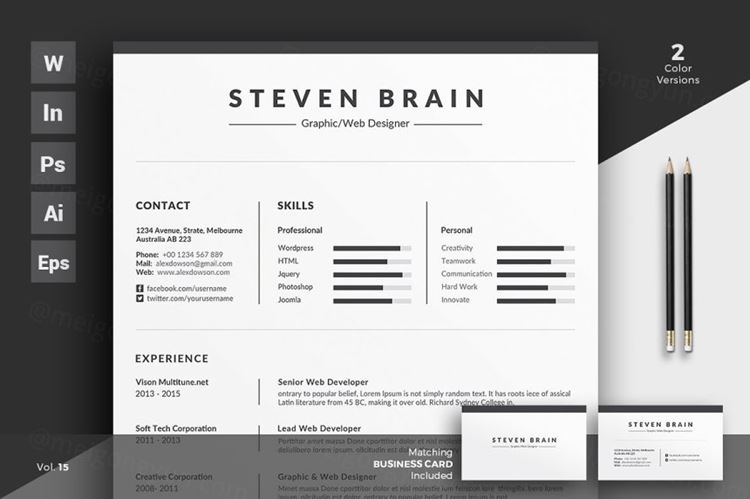 这个专业的简历和名片模板是在Adobe Photoshop,Illustrator,Indesign和MS Word又名Microsoft Word中制作的。这个简单/干净的简历模板是专业组织和标记的,所以每个初学者都可以像专业人士一样编辑它。