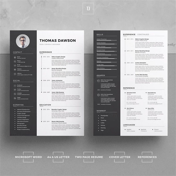 简历/简历 - TD,现代和专业设计,包括1和2简历/简历模板和求职信,免费名片。通过Microsoft Word编辑非常容易。所有细节都可以完全自定义并永久使用。您可以根据自己的喜好对这些模板进行任何调整。
