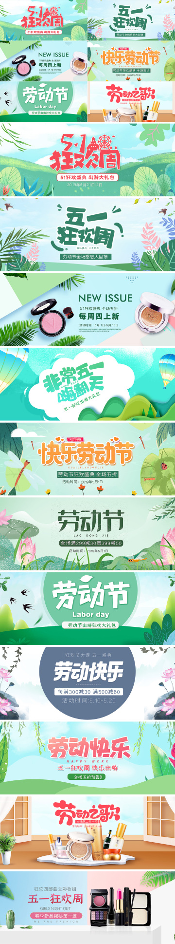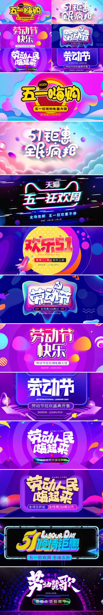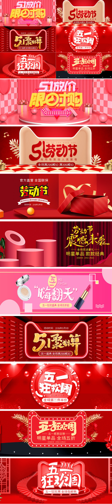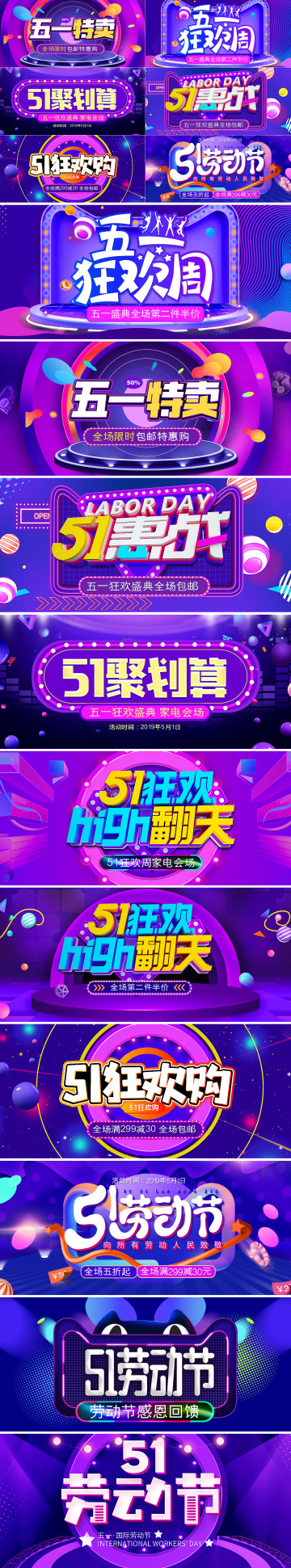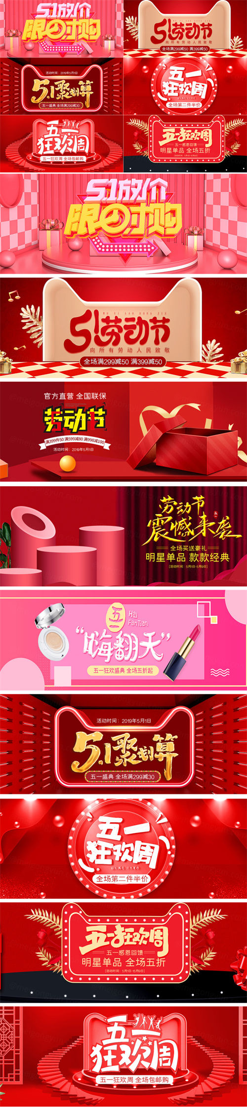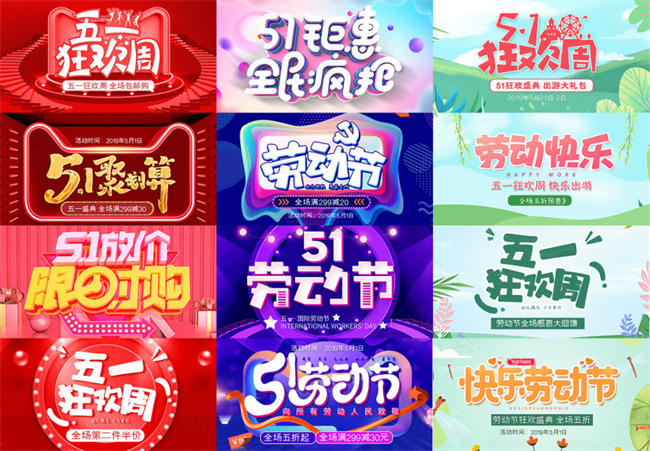 淘宝天猫51狂欢周五一劳动节三大风格海报PSD模板合集包免费下载