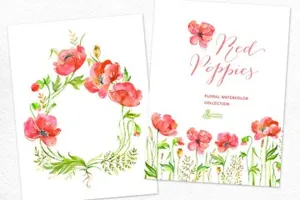 图穷联素材库 » 手绘水彩花卉logo设计 Red Poppies. Floral collection