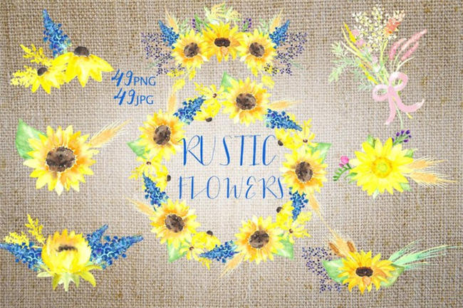 图穷联素材库 » 向日葵水彩logo设计 Sunflowers rustic watercolor clipart