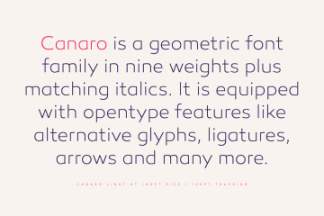 Canaro Free Demo字体Canaro被认为是对20世纪初期几何图形设计的探索,后来发展成为具有现代风格的那个时期的字体。缺少马刺可提供独特但不引人注目的外观并支持当代特征。此外,开放的形状与较高的x高度相结合,可在较小的文本尺寸下实现清晰易读的效果。此免费字体包含Canaro Light和Canaro Light斜体。