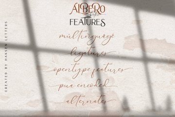 阿尔贝罗贝洛(Alberobello)包括两种字体样式,分别是用于脚本的华丽小写字母和用于衬线,数字,各种标点符号和连字的优雅大写字母。脚本的所有小写字母都包含开始和结尾的替代内容,从而提供逼真的手写样式。