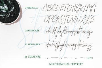 像往常一样,该字体具有许多开放式功能,例如Alternates,Ligature,26 Swashes,并且还支持多语言。您可以使用Opentype或Glyph程序(例如Adobe Illustrator cs,Adobe Photosop cc,Adobe InDesign等)访问所有这些备用字符。
