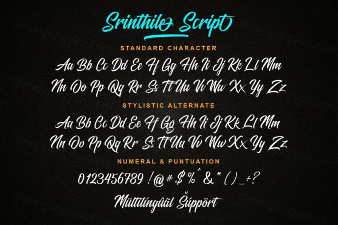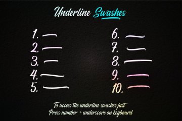 Srinthile Script带有大写,小写,数字,标点符号,每个字符都有很多变化,包括开放式替代,常用连字和下划线。要访问下划线,您只需在最后一个字母后按数字+下划线即可。有10种下划线样式可添加到您的炫酷项目中。完美用于徽标,信头纸,海报,服装设计,标签包装等。