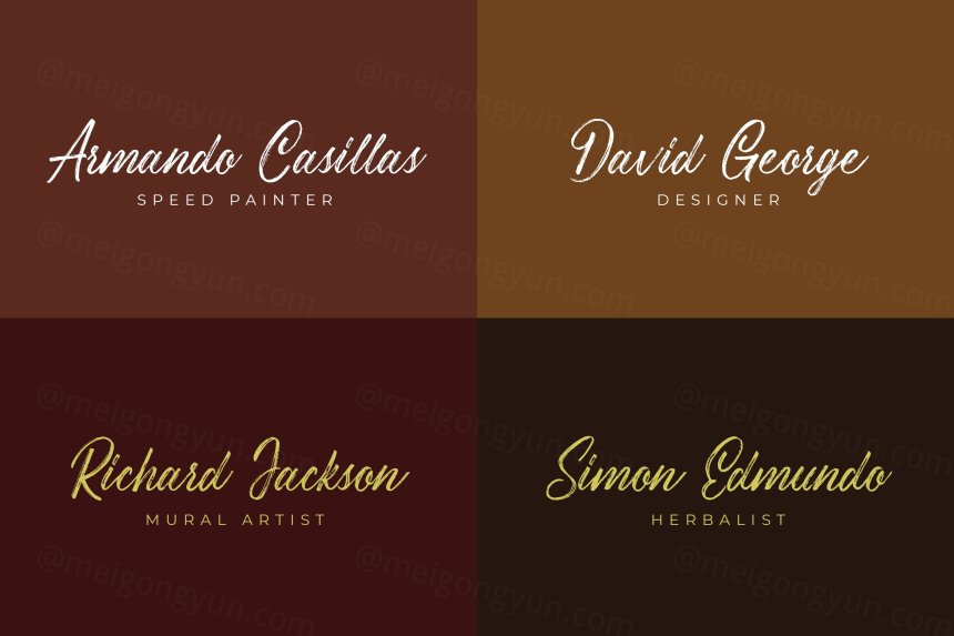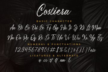 这就是为什么Costeria具有迷人,真实和轻松的特征,具有2种规则和倾斜变化的样式,使您的文本外观更自然,文本也更自然。您可以激活Ligature OpenType面板来制作这两种样式。它还具有许多替代方法和下划线,使您的文本和设计更加有趣。 Costiera非常适合用于家居用品设计,品牌项目,徽标设计,行情产品包装-或仅仅是将时尚的文字覆盖到任何背景图片上