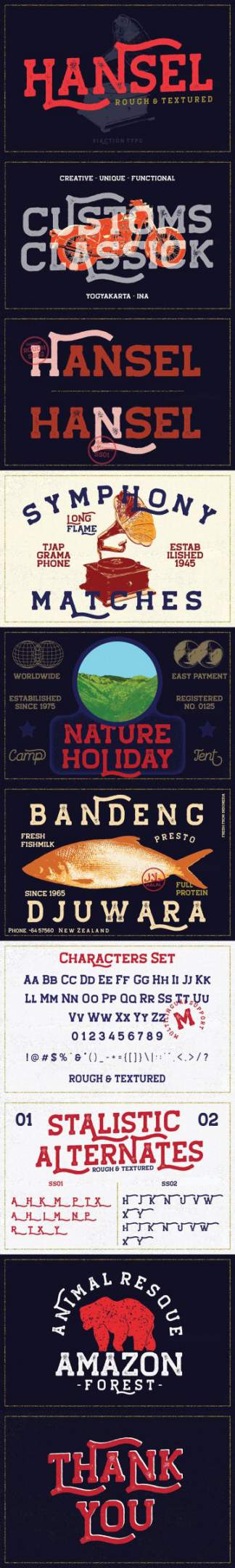 Hansel是一种板坯衬线,具有2种样式的粗糙和纹理,可很好地应用于各种产品。带有多语言字符和惯用替代词。它适用于报价,服装设计,复古徽标,标签,海报,包装设计和其他设计。