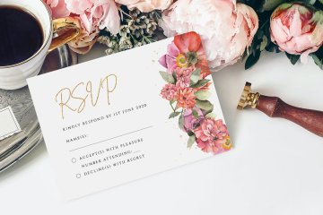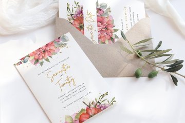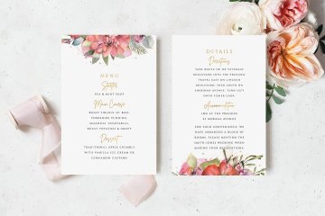 这款6件式的婚礼信纸模板具有色彩艳丽的粉红色和红色水彩花朵以及绿色的树叶-非常适合春季或夏季婚礼!