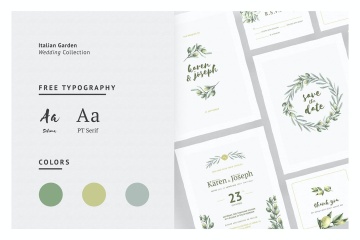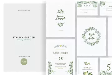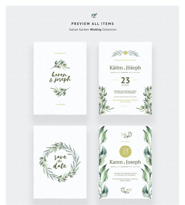 农场花园婚礼手绘水彩花束花卉邀请函矢量模板 Italian Garden Wedding Collection