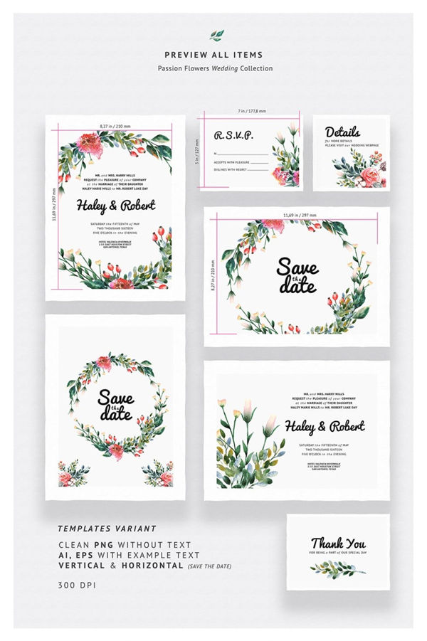 保存日期 8,27 x 11,69" x 2 邀请 8,27 x 11,69" x 2 RSVP 卡 7 x 5" 详细信息卡 5 x 5" 感谢卡 7 x 5" 产品特性
