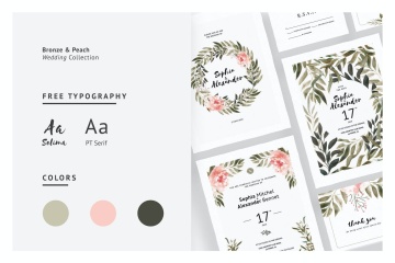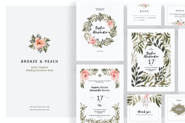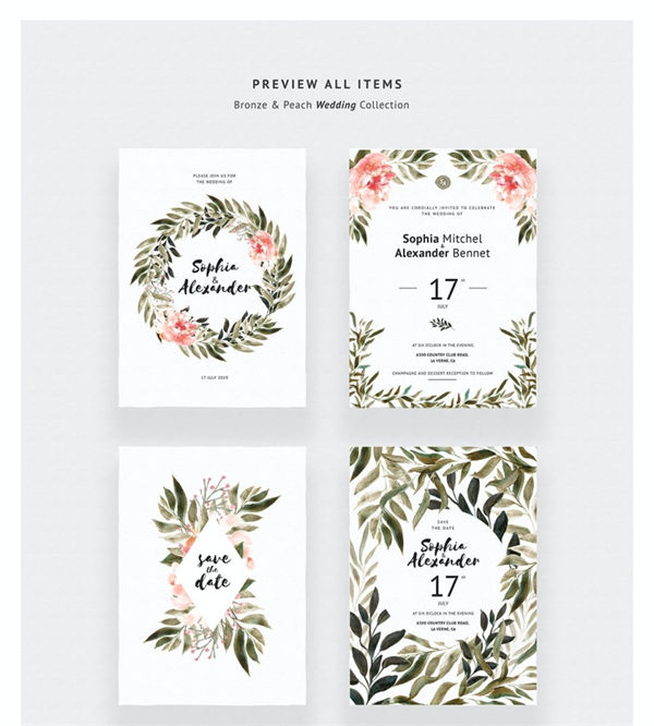 图穷联素材库 » 手绘水彩牡丹玫瑰婚礼邀请函请柬设计模板 Bronze Peach Wedding Invitations