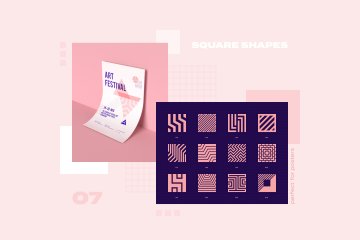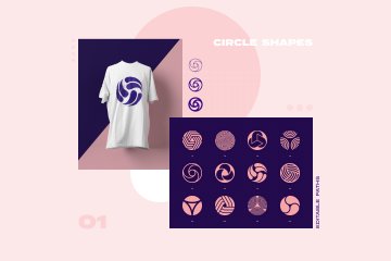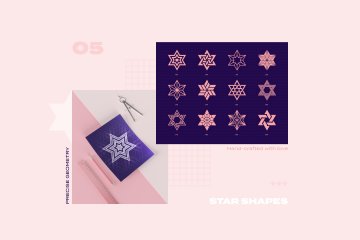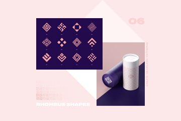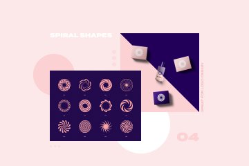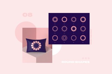 所有文件都整齐地组织成一个文件夹结构,以获得更好的工作流程体验。形状根据其图形样式和基本形式进行分组,例如圆形、三角形、螺旋形、六边形、星形、菱形和方形。为了强调形状的视觉形式,它们主要以淡粉色和海军蓝色显示,但您可以应用自己的调色板并单击几下添加您的品牌名称。