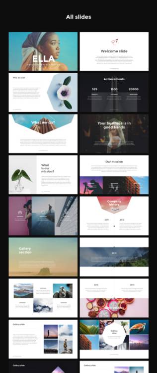 ELLA it’s simple and beautiful clean presentation for PowerPoint and Keynote. ELLA includes 86 amazing quality slides. It focuses on easy submission of information. This presentation suitable for multipurpose business or personal use, such a startup and more. Also, please note that the used images are not included in presentation and animation for keynote and for powerpoint have differences.