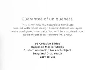 Eva is a multipurpose template that will meet the latest design trends, as well as extremely easily customized by any user without any previous knowledge in PowerPoint or Keynote. Each slide was thought out and easily can be adjusted to suit individual goals. You can use vector icons from the embedded 250+ collection. Additionally, every customer will receive the brand new collection of 4500+ Free Vector Icons adapted for presentations. Everyone will find the right for yourself. Perfect for Fashion, Nature, Photography and Restaurants. Please note, preview images are NOT included in Presentation Template!