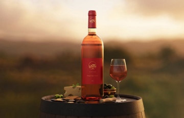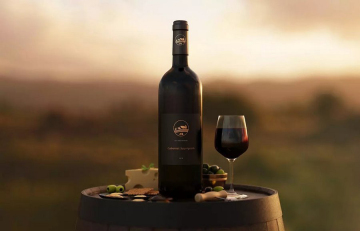 红酒葡萄酒玻璃瓶瓶贴标签酒桶户外场景展示效果图