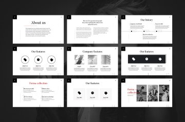 Forma演示文稿包含超过50个幻灯片模板:英雄幻灯片,关于,时间轴,功能,列表,投资组合,单项,设备,图表,地图,图标。