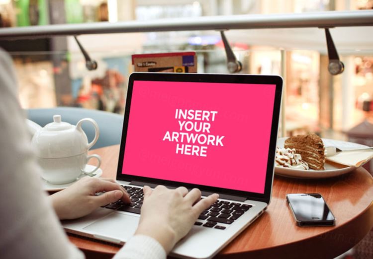 咖啡店场景笔记本电脑贴图样机MacBook Pro PSD Mockup