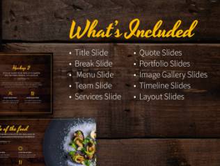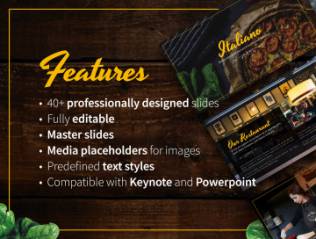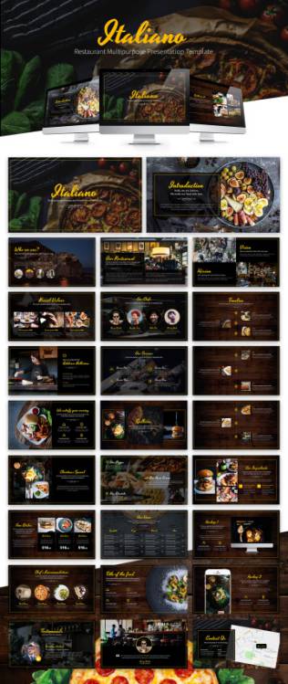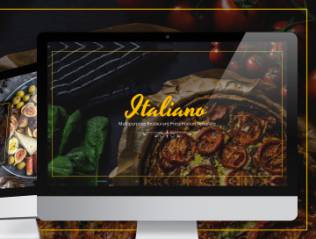 Italiano是一个以Keynote,Powerpoint和Google Slide为主题设计的餐厅主题演示模板。