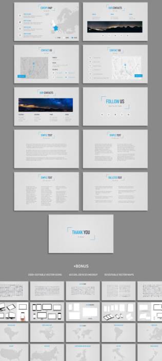 100+独特幻灯片+奖金:3300+可编辑矢量图标,40多个酷设备模型和50个可编辑矢量地图!