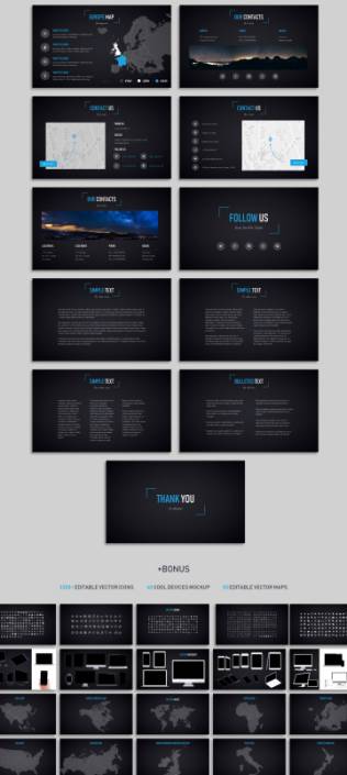 100+独特幻灯片+奖金:3300+可编辑矢量图标,40多个酷设备模型和50个可编辑矢量地图!