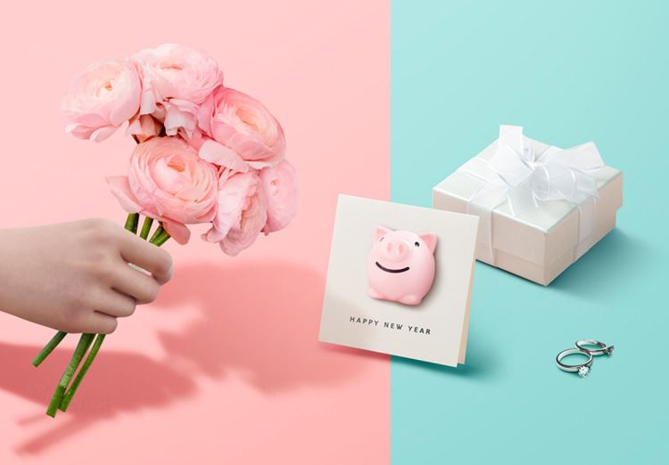 2019年最新粉红色品牌VI场景海报设计元素【玫瑰花、礼品盒、卡片】