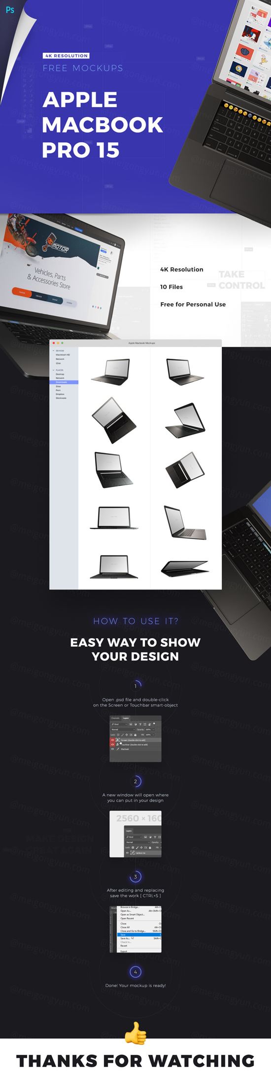图穷联素材库 » 苹果笔记本多视角贴图样机展示模版 Apple Macbook Pro 15 with Touchbar | Mockups