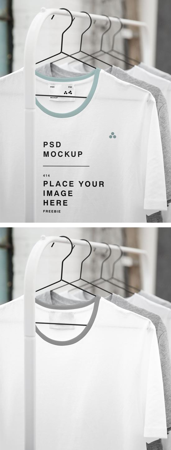 图穷联素材库 » 挂在晾衣杆的T恤场景贴图样机PSD模板 Hanging T-Shirt Mockup