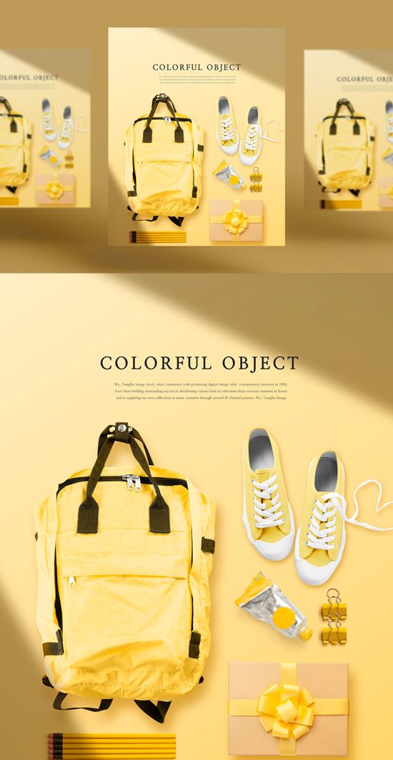 图穷联素材库 » 黄色VI品牌背包文具套装设计展示样机