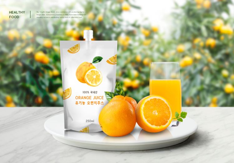 图穷联素材库 » 橙汁果汁幼稚PP自立吸嘴袋场景包装展示样机