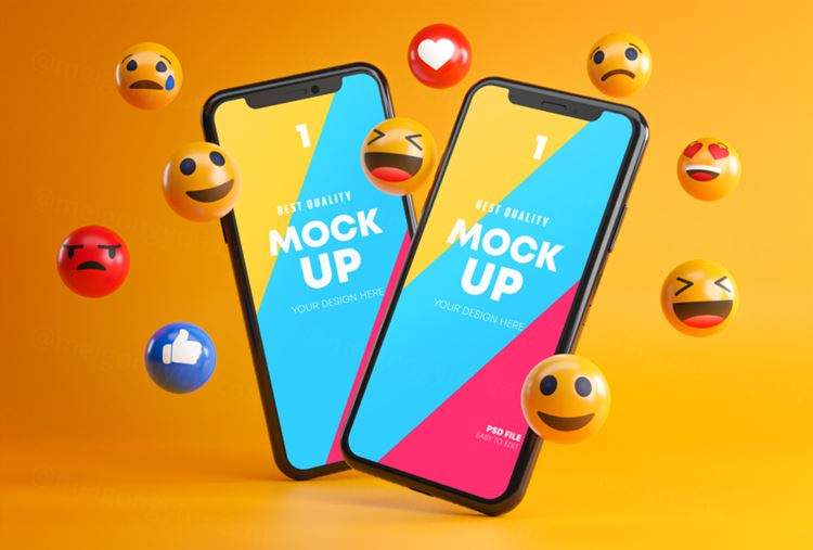 图穷联素材库 » 智能手机3D立体表情符号场景UI提案样机PSD模板 Smartphone Emoji Mockup Pack
