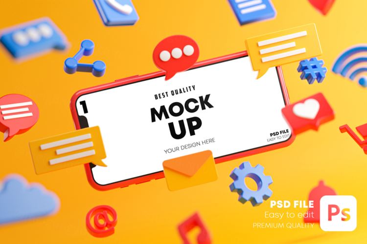 图穷联素材库 » 3D概念场景社交媒体APP UI提案样机PSD模板 Social Media Icons Smartphone