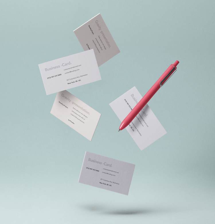 图穷联素材库 » 组漂浮的名片样机和铅笔样机 Gravity Psd B-Cards Mock-Up Vol6