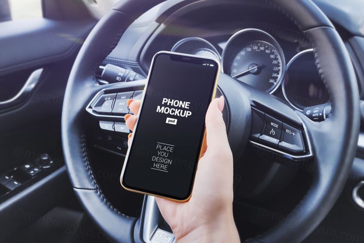 图穷联素材库 » 车内手持手机车载互联APP设计提案PSD样机模板 Hand Holding Phone in Car