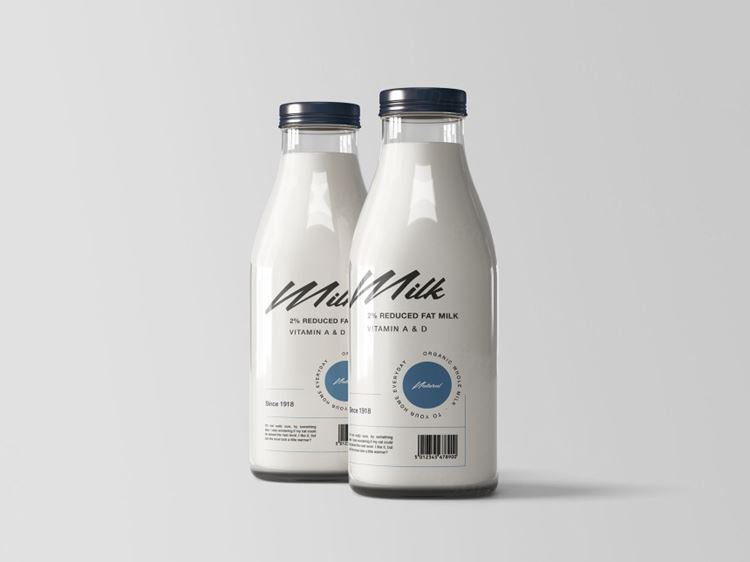 两瓶透明玻璃牛奶瓶装样机乳制品品牌设计提案 Two Milk Bottles Mockup