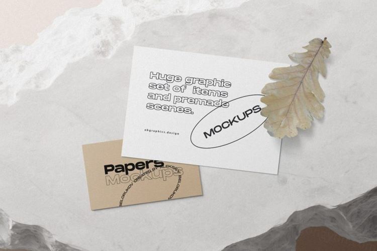 图穷联素材库 » 纸张卡片橡树叶场景贴图品牌提案样机模板 Paper Cards With Oak Leaf Mockup Top View