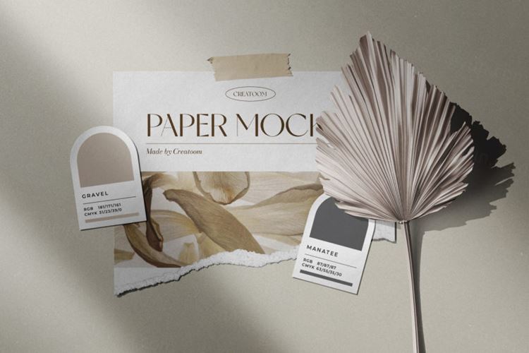 图穷联素材库 » 撕裂的纸张色卡干树枝品牌设计提案样机模板 Moodboard Paper Color Pallete Mockup