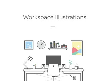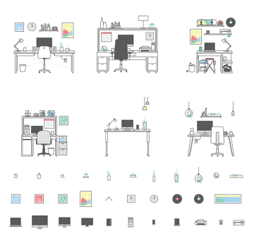 A clean collection of premium & unique workspace illustrations. Use this handy kit to create your perfect workspace with 6 ready to use scenes, over 115 unique objects, and 6 different desk styles this kit is sure to have what you need.